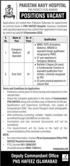 Candidates, if you are seeking Pakistan Navy Hospital Jobs in November 2025 in Islamabad, yes. Then it would help if you tried to complete the Pakistan Navy Hospital Jobs because here you can easily apply for these vacancies: Emergency Medicine Specialist and Echo Tech.