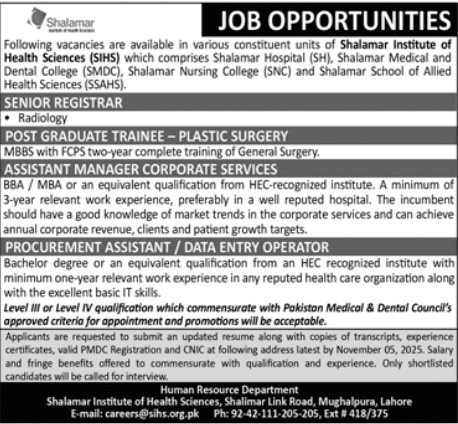 Candidates, if you are seeking Shalamar Institute of Health Sciences Jobs 2025, Apply Online yes. Then it would help if you tried to complete the Shalamar Institute of Health Sciences Jobs because here you can easily apply for these vacancies: Senior Registrar, Procurement Assistant/ Data Entry Operator, and Assistant Manager Corporate Services.